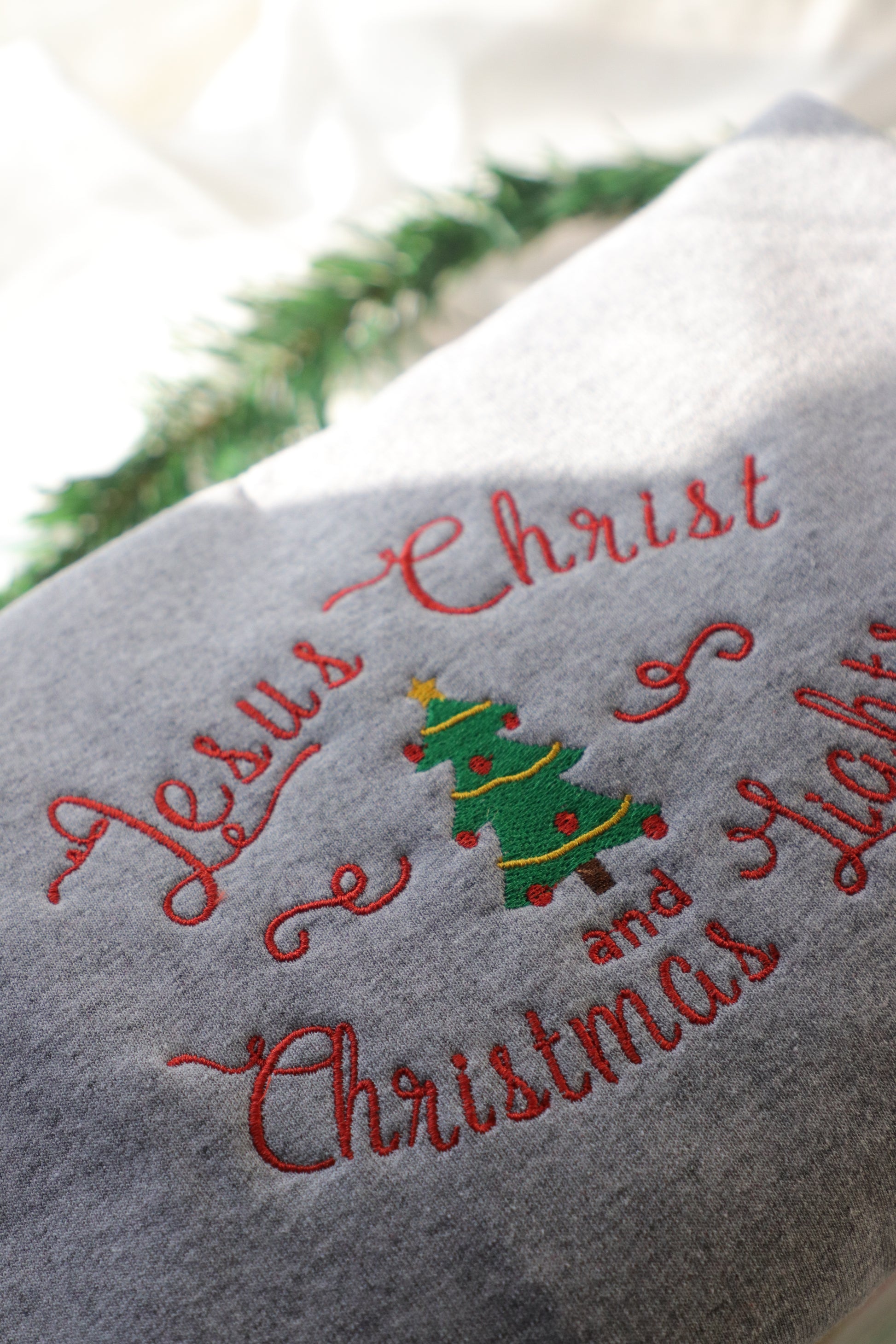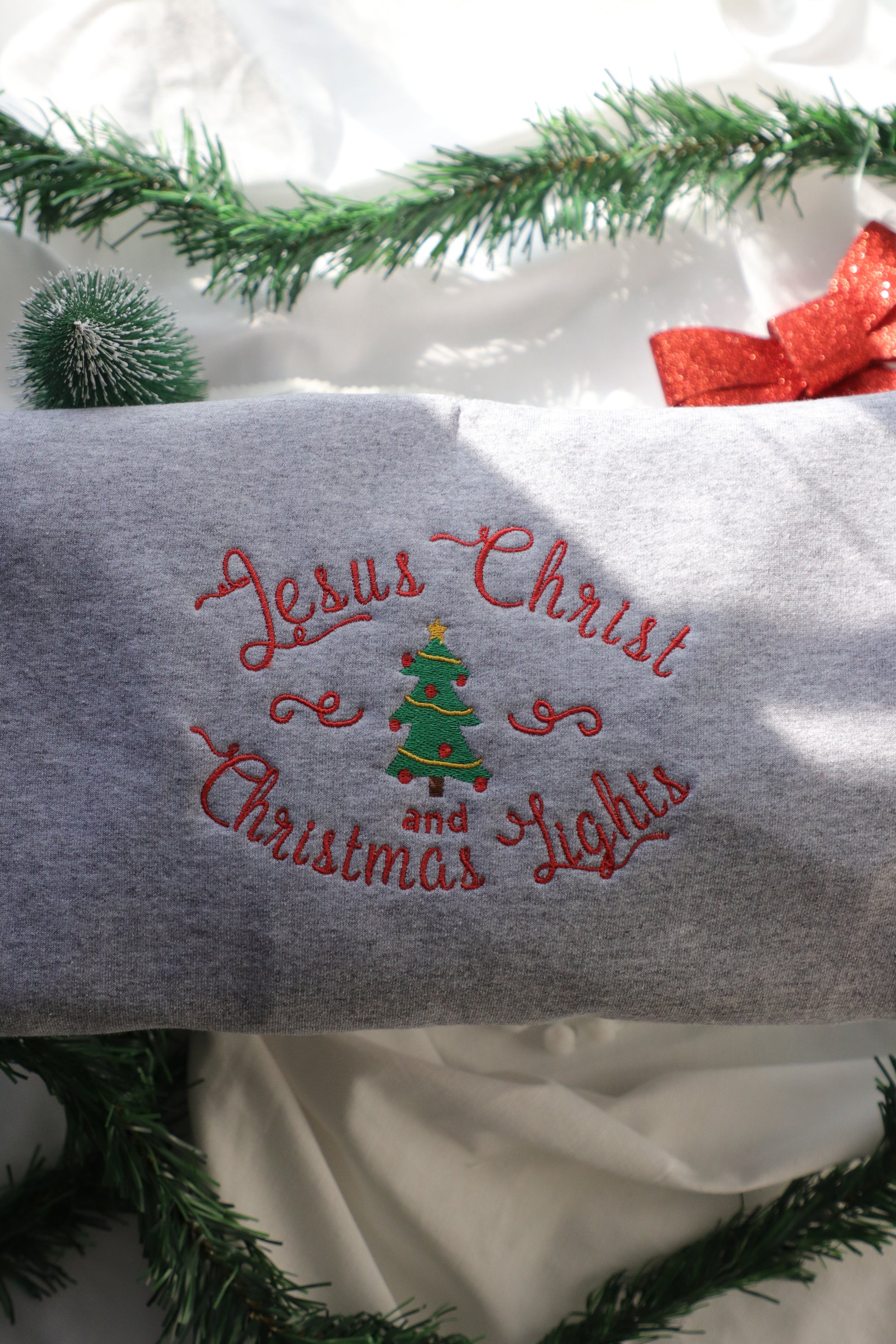 Jesus Christ & Christmas Lights Embroidered Crewneck