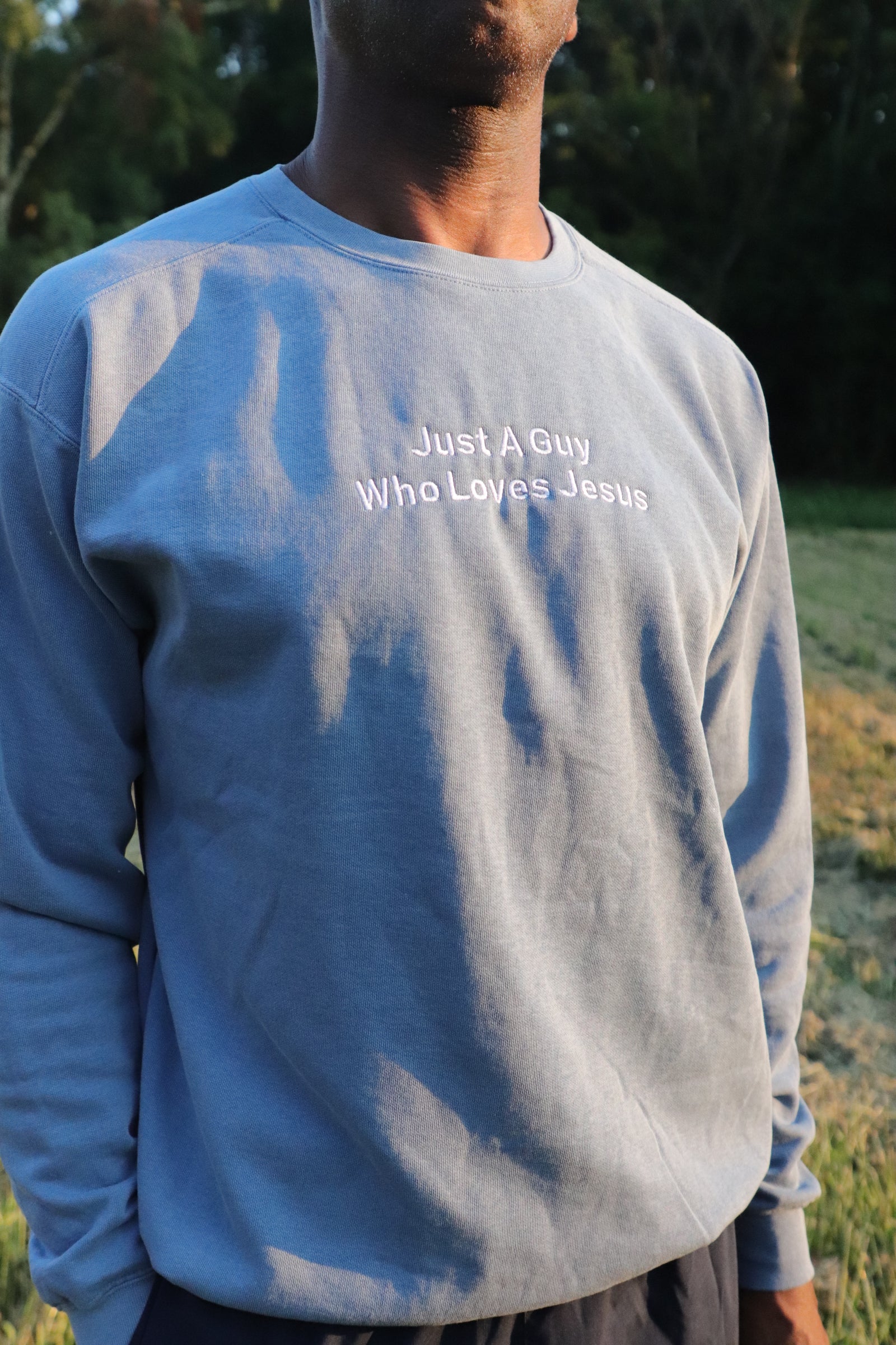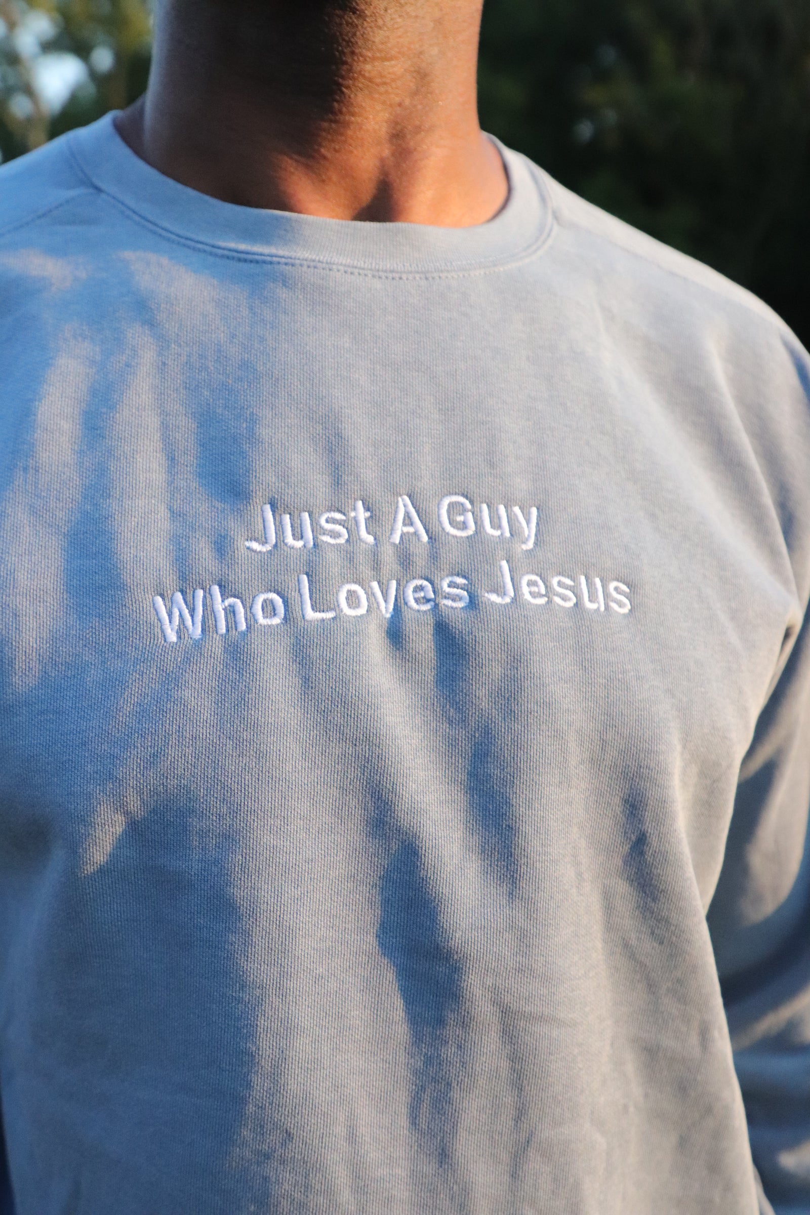 Just A Guy Who Loves Jesus thick comfy crewneck. Made with soft blue material, this crewneck is perfect for showing off your love for Jesus.