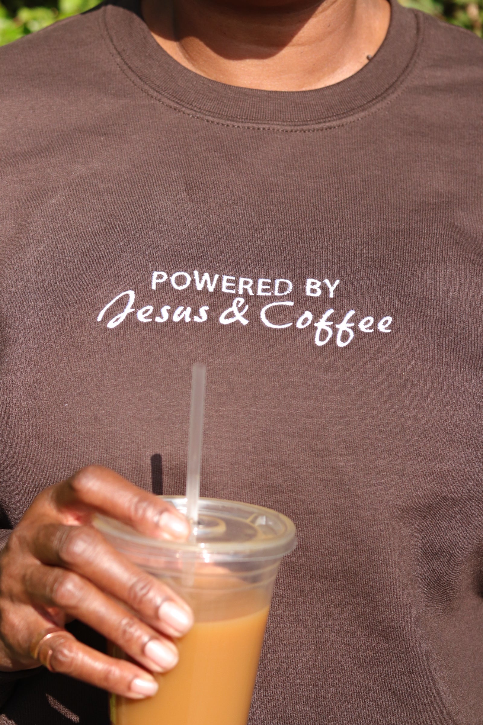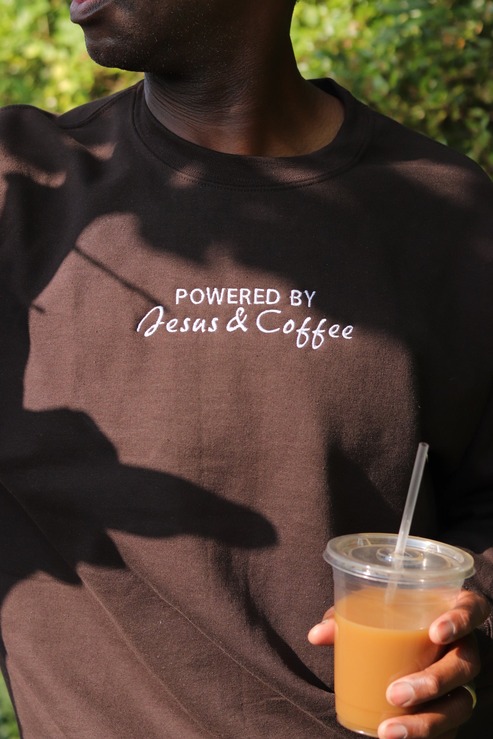 This brown crewneck features a white embroidered design that reads "Powered by Jesus & Coffee". The warm, loose-fitting crewneck design offers both comfort and style.